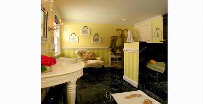Pewarnaan kamar mandi ini terinspirasi dari era awal abad 20. Nuansa kuning-kehijauan pada dinding dan tumbuhan rambat berwarna pink menyajikan kontras yang cantik dengan lantai marmer hitam dan warna kalem yang mendominasi keseluruhan ruangan.